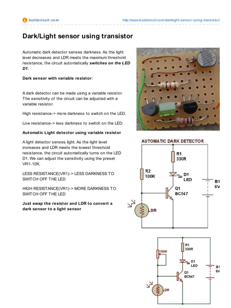 Automatic dark detector senses darkness. Resistors in automatic light detector. When we place a photoresistor in series with a resistor, a voltage divider. The ldr is a variable resistor whose resistance decreases with the increase in light intensity. With the feedback, it became largely independent of frequency.
