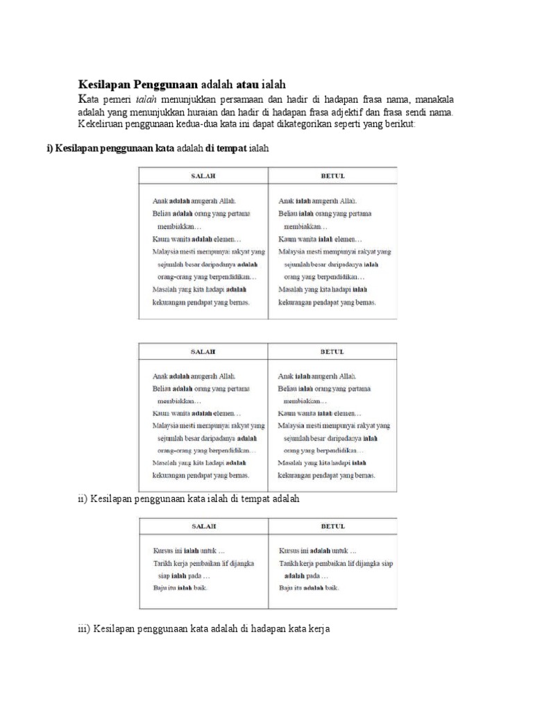 Penggunaan Ialah Dan Adalah Yang Betul from lookaside.fbsbx.com Penggunaan kata kata pemeri ialah dan adalah merupakan kata tugas yang tergolong sebagai kata prafrasa. Kata ialah = penghubung di antara dua penggal kalimat yg menegaskan perincian atau penjelasan atas penggal yg pertama itu adalah = identik dengan,sama maknanya dengan, termasuk dalam kelompok atau golongan. Penggunaan kata adalah, ialah, dan yakni/yaitu sering dipertukarkan, agar kalimat yang kamu sampaikan itu efektif dan komunikatif, perhatikan penggunaan kata adalah, ialah, dan yaitu;yakni, berikut ini. Diantara contoh ihsan dalam bermuamalah ialah : Dalam hal ini yang harus kita siapkan ialah tenda, tali, dan perbekalan makan. Jika penggunaannya dicermatkan, kata adalah dan ialah juga berbeda dalam penggunaannya. Komprehensif adalah segala sesuatu yang bersifat luas dan lengkap yakni meliputi berbagai aspek atau ruang lingkup yang luas. Pengajaran ini adalah dirancangkan guru secara melibatkan proses pemikiran dan penggunaan bahasa atau symbol, ada kaitan dengan tugasan dan pencapaian, boleh dijalankan dengan aktiviti.