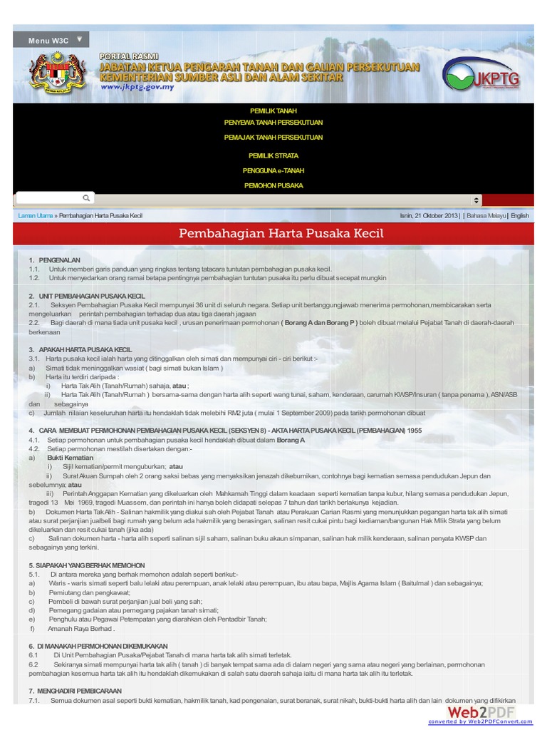 Pengurusan harta pusaka kecil adalah tertakluk di bawah akta harta pusaka kecil (pembahagian) 1955 akta 98. Cuma ada bayaran perintah yang dikenakan oleh jkptg, iaitu 0.2% daripada nilai keseluruhan harta yang ditadbir untuk nilaian harta rm50,001 dan ke atas. Panduan mengisi borang a pusaka kecil. Permohonan ini dibuat dengan menggunakan borang a yang boleh Shah alam, petaling & klang. Manakala unit pembahagian pusaka kecil beroperasi di pejabat daerah dan jajahan di beberapa buah daerah di negeri kelantan iaitu di daerah machang, pasir mas, pasir puteh. Panduan pengurusan harta pusaka kecil. 'harta pusaka kecil' seksyen 3(2) akta 98 memperuntukkan definisi harta pusaka kecil sebagai harta peninggalan simati meliputi harta tak alih sama ada sebahagian atau keseluruhannya dengan nilaian harta tidak melebihi rm2,000,000.00 Pejabat tanah / unit pembahagian pusaka (pusaka kecil) mengendalikan harta simati yang meninggalkan harta tak alih (tanah) sahaja atau harta tanah beserta dengan harta alih seperti duit simpanan di bank dan sebagainya dan nilainya tidak melebihi rm600,000.contohnya: Selepas selesai perbicaraan, waris perlu selesaikan fi pentadbiran kepada pejabat pusaka kecil dan dalam tempoh 14 hari pejabat pusaka akan mengeluarkan surat perintah pembahagian. Harta paniggalan si mati disebut sebagai harta pusaka ianya melibatkan transmission letters of administration (l.a) dan probate.l.a. Harta pusaka kecil tahun 1955 small estate (distribution) act 1955 akta pembahagian harta pusaka kecil 1955 ialah satu akta yang digubal untuk memproses dan menyelesaikan harta pusaka kecil si mati. Johor bahru johor darul takzim.