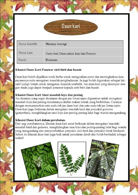 Daun segugur lepidagathis longifolia derhaka mertua plumbago indica dukung anak phyllanthus niruri. Membiak melalui bijibenih dan keratan batang atau anak. Daun kari juga sangat berguna bagi mengatasi masalah kencing. Serbuk kari adalah campuran lebih daripada 20 rempah dan herba yang dikisar bersama. (daun kelor) pasti ramai yang masih lagi belum tahu tentang pokok moringa ini yang turut dikenali dengan berbagai nama di malaysia seperti rembungai, remunggai, lemunggai, merunggai, gemunggal, murungai, pokok kelor dan beberapa nama lain mengikut tempat. Timun tikus sedap buat ulam untuk kencing manis. Zingiberaceae pendahuluan 'tumeric' merupakan sejenis tumbuhan yang dijadikan bahan rempah yang memberikan warna kuning cerah khususnya masakan kari bagi orang melayu dan india. Murraya koenigii adalah nama saintifik bagi daun yang kita kenali sebagai daun kari yang datang dari pokok kari. Diperkarangan rumah keterangan pokok kari ialah sejenis pokok renek yang mempunyai ketinggian antara 0.9 hingga 6 meter.ia biasa ditanam dihalaman rumah kerana kegunaan sebagai rempah dalam masakan terutamanya dalam masakan. Terdapat beberapa spesies dalam famili pandanacea antaranya ialah pandan wangi atau daun pandan yang digunakan dengan meluas dalam kebanyakan masakan melayu tradisional. Batangnya sebelum muncul daun disokong oleh akar yang timbul dari permukaan tanah. Daun kari mempunyai bau yang kuat dan mempunyai rasa agak pahit. Daun kari mempunyai bau yang kuat dan mempunyai rasa agak pahit.